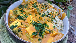 Sesame Halloumi with Brussels Sprouts, Jalapeño Yogurt and Tabbouleh